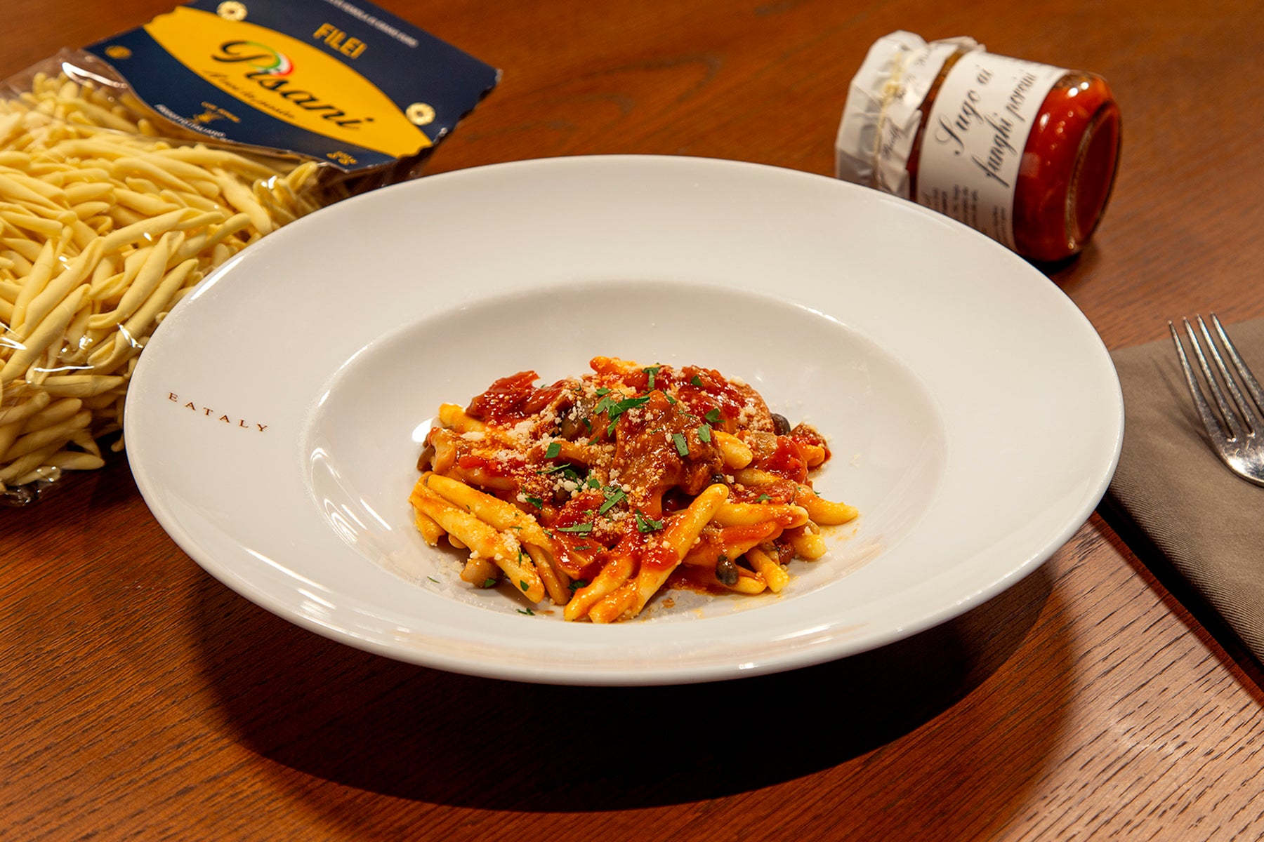 南イタリアはカラブリア州で栽培されたデュラム小麦を使った手打ち風のフジッリ。程よいねじれがソースを絡みやすくしています。この季節に召し上がっていただきたいのは、ポルチーニ入りのトマトソース。しっかりとポルチーニの香りを楽しむのに、このパスタの形状がとても相性が良く、おすすめの組み合わせです。温めたソースに茹でたパスタを絡めるだけで手軽にお楽しみいただけます。